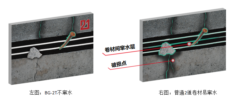 將4mm厚 BG-2T丁基改性雙胎基防水卷材空鋪在基面上(納米防粘抗紫外晶體朝上),然后澆筑結(jié)構(gòu)混凝土,使混凝土漿料與卷材膠膜層緊密結(jié)合的施工方法。